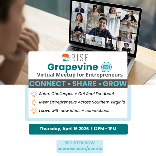 Join us for the next RISE Grapevine Virtual Meetup on April 16, 2026, from 12:00 – 1:00 PM on Zoom. This monthly online gathering is designed for entrepreneurs and small business owners in rural Southern Virginia to connect, share ideas, and gain valuable insights in a casual, supportive environment.