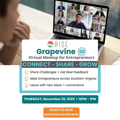 Join us for the next RISE Grapevine Virtual Meetup on Thursday, November 20, 2025, from 12:00 – 1:00 PM on Zoom. This monthly online gathering is designed for entrepreneurs and small business owners in rural Southern Virginia to connect, share ideas, and gain valuable insights in a casual, supportive environment.
